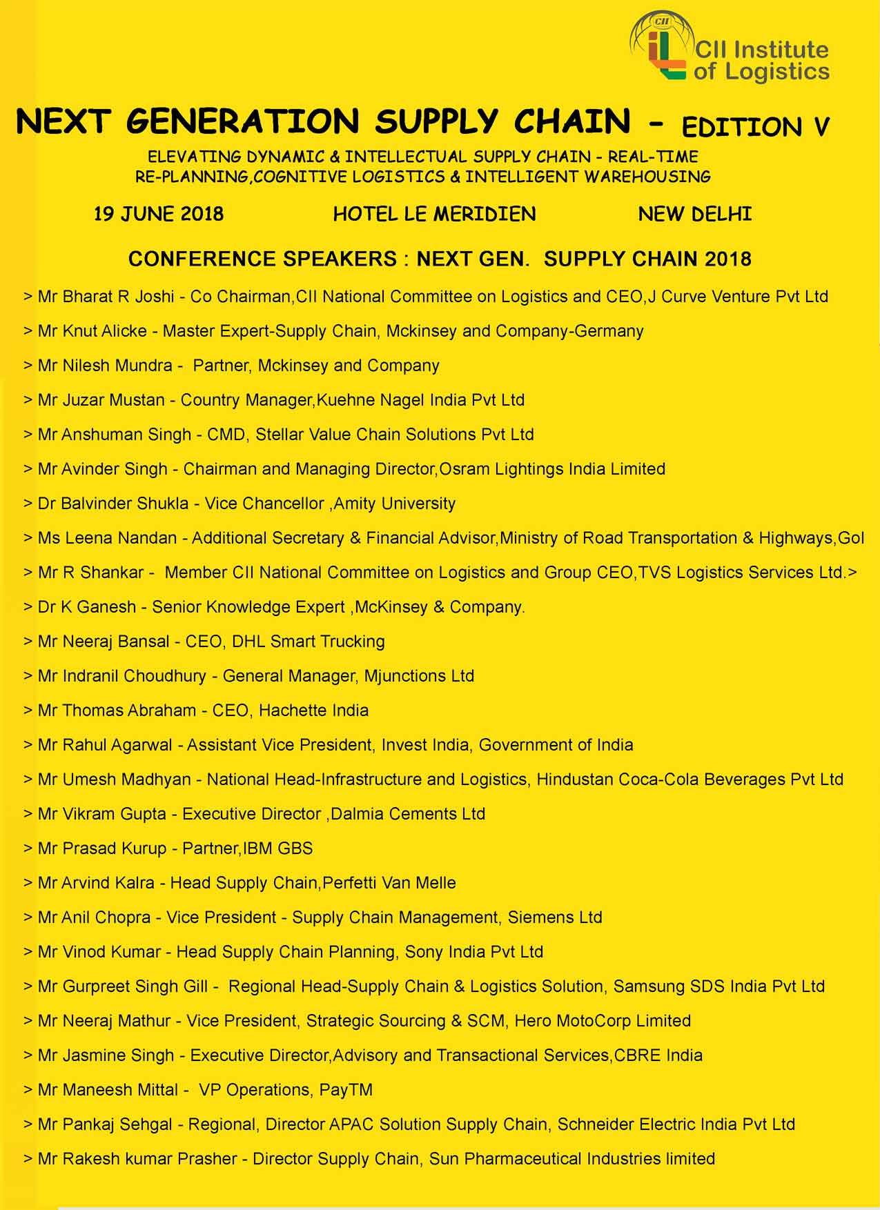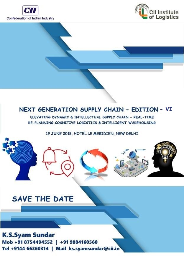 In this back ground CII Institute of Logistics is organizing the sixth edition of the Conference "Next Generation Supply Chain" with the theme "Elevating Dynamic & Intellectual Supply Chain" on 19 June 2018 at Hotel Le Meriden, New Delhi.